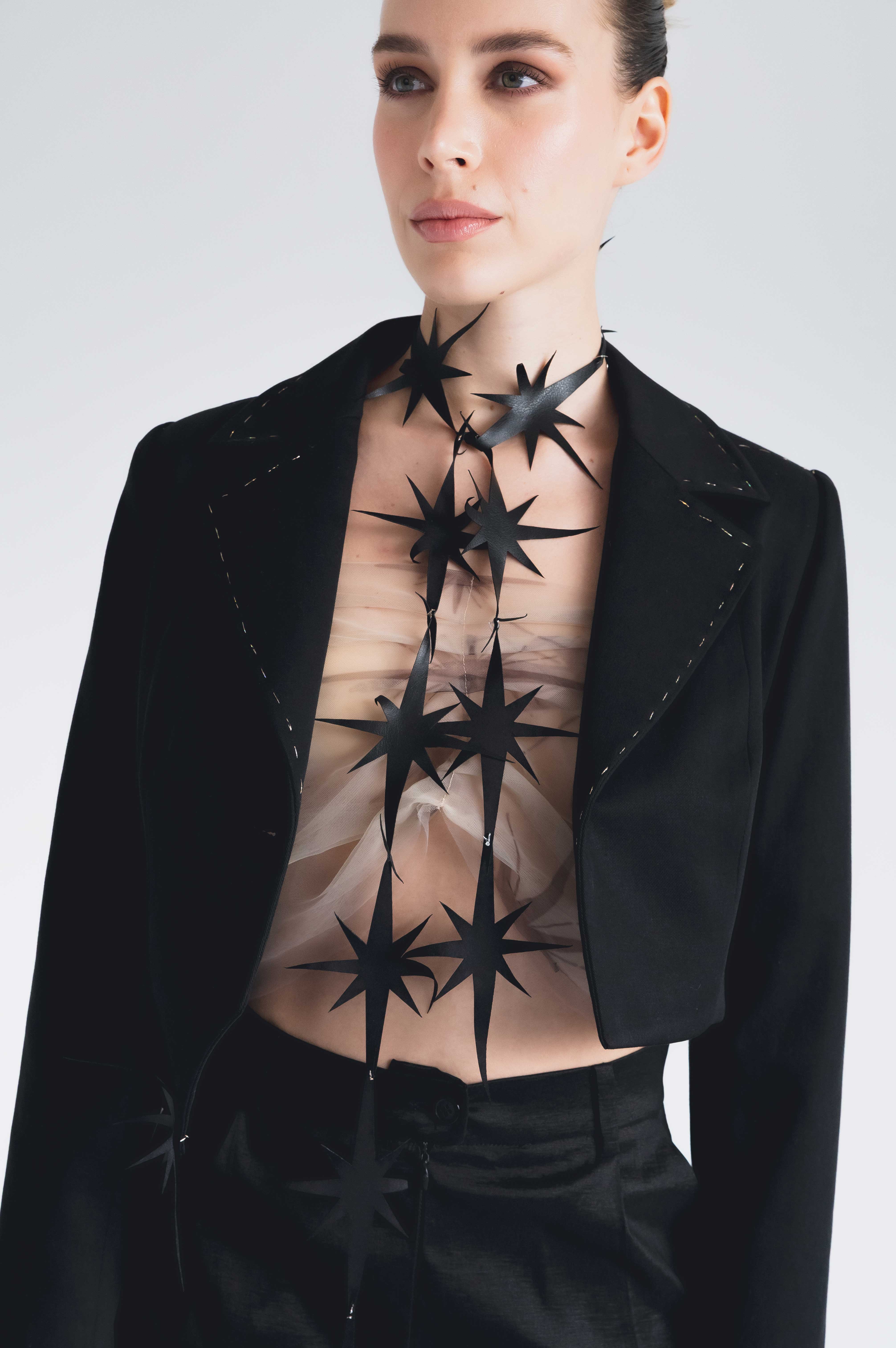 El símbolo icónico de la estrella cobra vida en una composición escultórica, donde piezas de cuerina negra han sido cortadas a láser y fijadas con puntadas de hilo dorado realizadas a mano. Este accesorio no es solo un complemento, sino una declaración visual que refuerza el concepto astral de la colección, aportando dimensión y movimiento al escote.