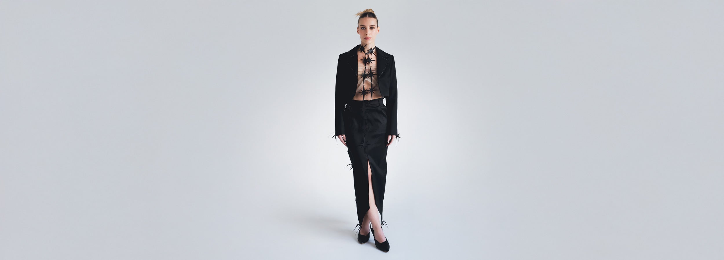 El look COSMOS transforma la monocromía del negro en un lienzo de expresión vibrante, donde los símbolos icónicos de la marca brillan con fuerza. Esta combinación de estructura y fluidez destaca la silueta femenina, realzando su poder a través de cortes meticulosamente diseñados y detalles bordados. Cada pieza es un statement, una celebración del trabajo manual que resalta la artesanía y la elegancia atemporal.