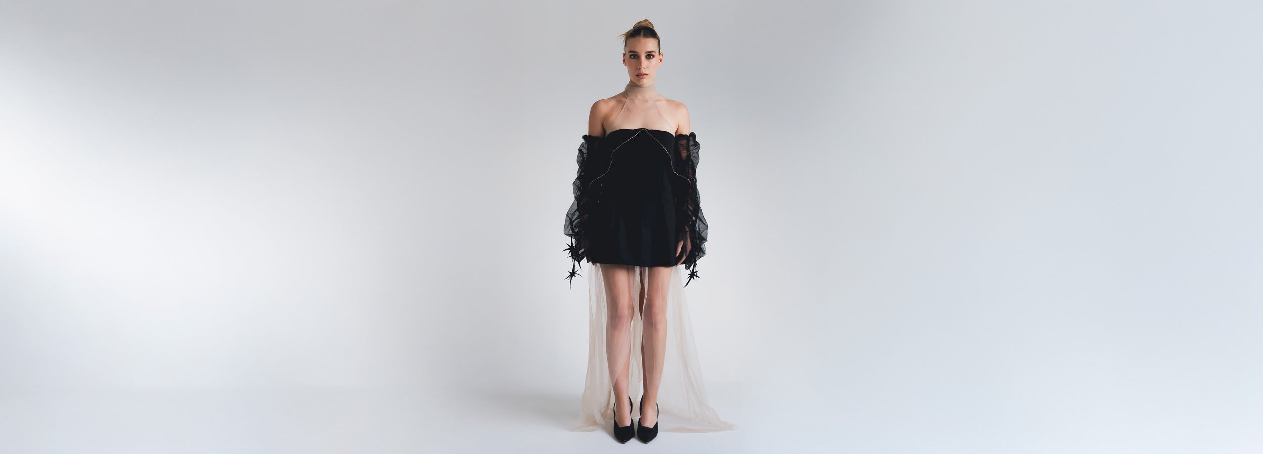 Parte superior silueta esculpida con dos cortes en punta que evocan la forma de una estrella. Cada borde está bordado a mano con canutillos dorados, añadiendo un destello sutil. La parte superior del cuello, en tul transparente, se une con tiras del mismo material que caen con suavidad, permitiendo ajustarse de diferentes formas. La parte inferior, la falda es Ligera y etérea, se mueve con fluidez. Una abertura lateral añade un toque de sensualidad y dinamismo al diseño.